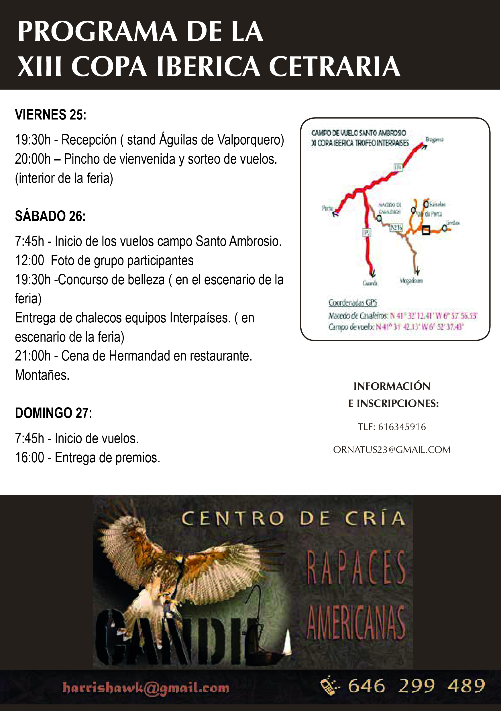 Ademas de este medio para comunicaciones usamos la cuenta de facebok. "XIII Copa Ibérica de cetreria" el correo electronico ornatus23@gmail.com y en el tel. 616345916 Jose Antonio Alonso Perez