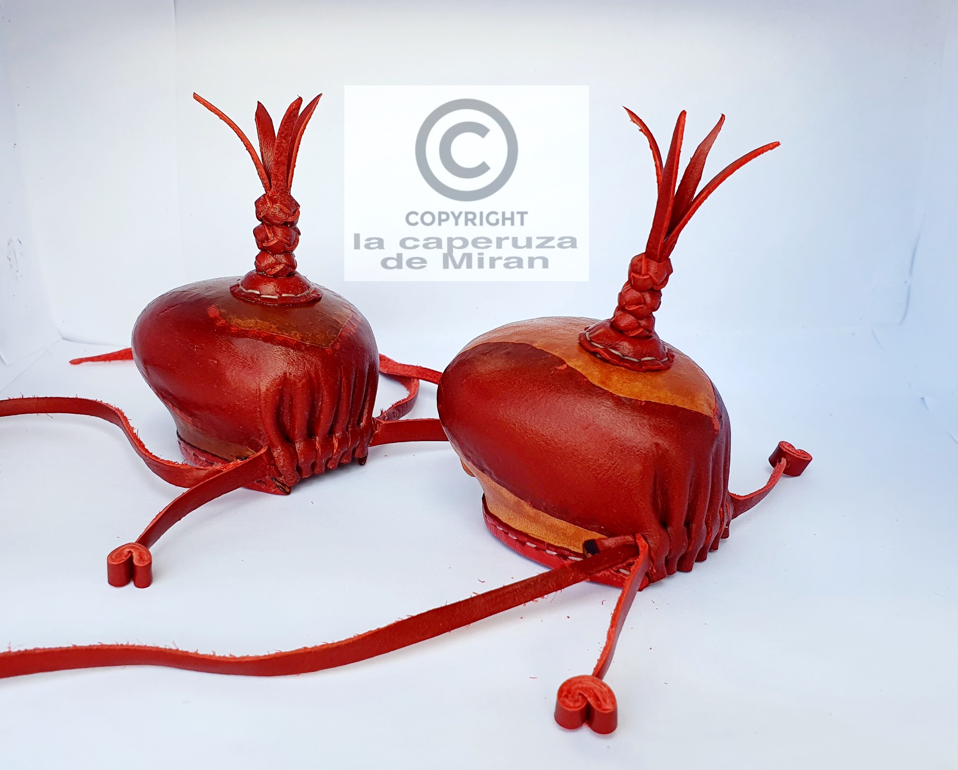 Las caperuzas también se pueden realizar repujados plumas y distintos copetes brillantes, tradicionales ,bolitas etc.... (serpientes ralla .salmón.) .según el gusto del cetrero . Incrementando su precio ....